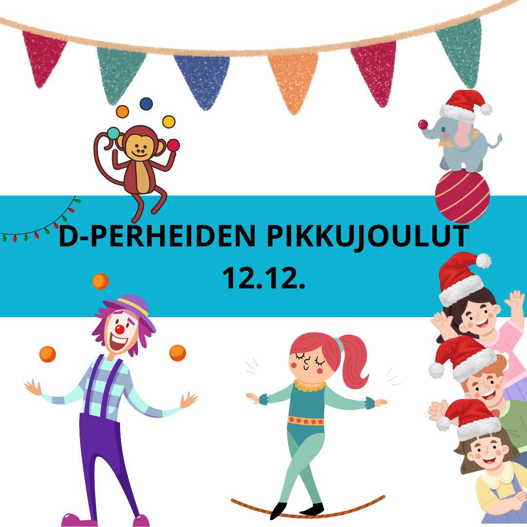 Tervetuloa mukaan D-perheiden Pikkujouluihin sirkusteemalla pe 12.12. klo 18-20. Pikkujoulut pidetään Sirkus Magentan Sirkustilassa kauppakeskus Itiksessä. Pikkujoulut ovat osallistujille maksuttomat.…
